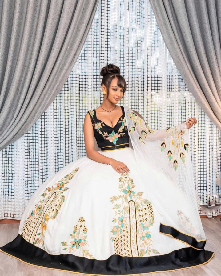 This stunning Habesha dress features a flowing white gown adorned with intricate black and gold embroidery, complemented by vibrant turquoise accents. The elegant V-shaped neckline and matching sheer overlay enhance its beauty, while the full skirt creates a graceful silhouette. Perfect for special occasions, this attire showcases a harmonious blend of tradition and modern style.