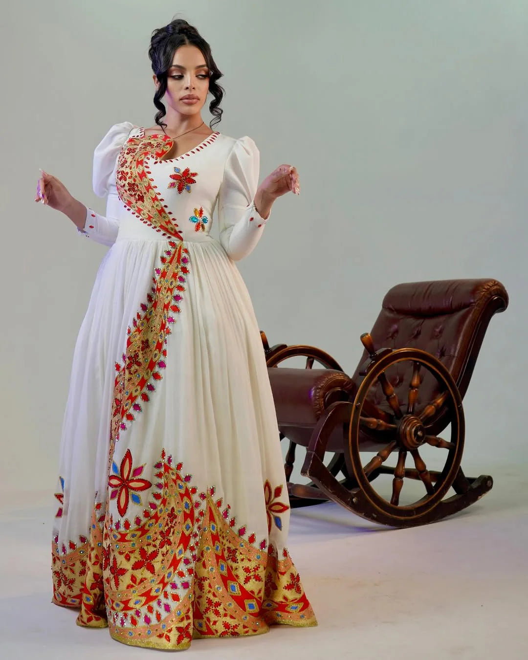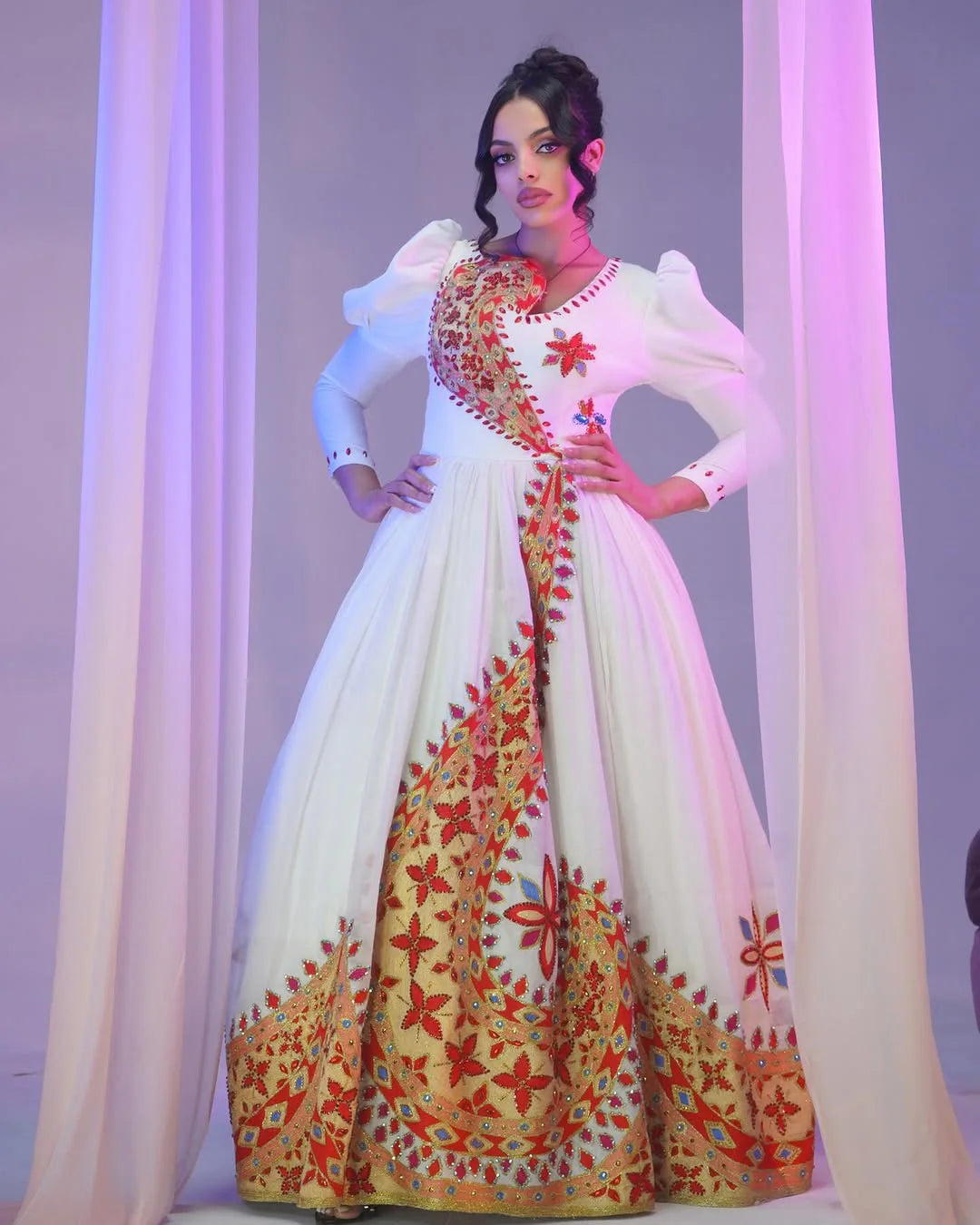 Embracing the timeless elegance of Habesha traditional clothing, this Habesha wedding dress showcases delicate craftsmanship with patterns reflecting cultural symbolism. The soft, white Menen fabric is accentuated by vibrant red, and gold Tilef, eluding beauty and sophistication. Perfect for celebrations, this traditional wedding dress blends tradition with contemporary style, creating a statement of pride and beauty.