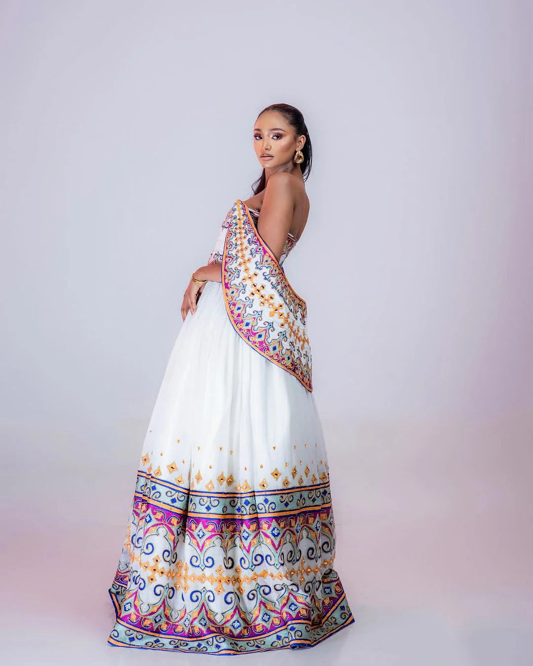 Explore our "Radiant Reverie" collection, where the Habesha Kemis blends timeless beauty with modern elegance. Each dress features vibrant motifs and intricate beadwork, celebrating Habesha culture. Make your wedding day a memorable celebration of love in a stunning Habesha dress.
