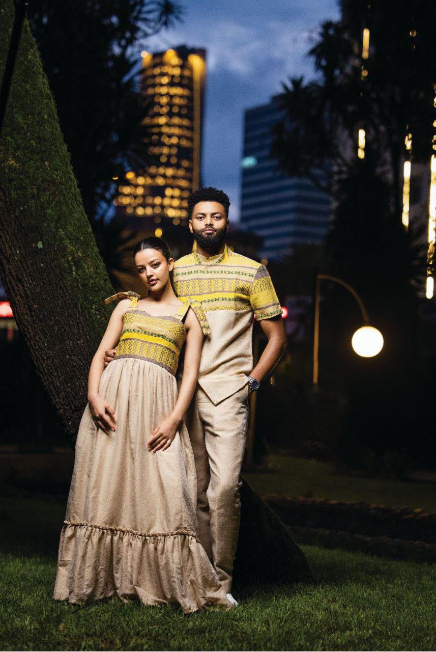 The image showcases a couple in stunning Habesha attire, beautifully illuminated against a nighttime city backdrop. The woman wears a graceful beige dress featuring a vibrant yellow embroidered bodice, creating a striking contrast and an elegant silhouette. The man complements her look with a matching beige shirt adorned with yellow accents, exuding a modern yet traditional charm. Their coordinated outfits celebrate the rich heritage of Habesha fashion while embracing contemporary design elements, making them stand out in the evening setting. The urban environment enhances the sophistication of their attire, blending culture with modernity.