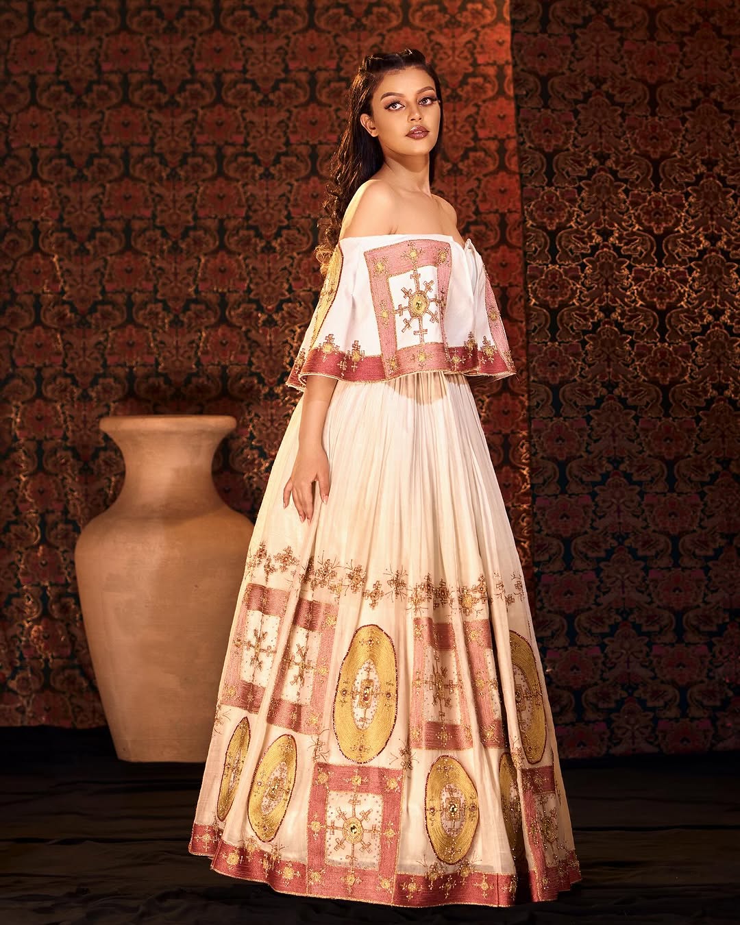 The garment showcases contemporary Habesha clothing, blending traditional and modern design. With an off-shoulder neckline and flowing sleeves, it creates a graceful silhouette. The fabric features intricate patterns and vibrant colors, reflecting Ethiopian and Eritrean heritage. The long, embroidered skirt adds elegance, making it perfect for special occasions. This piece exemplifies the fusion of tradition and modernity in Habesha fashion.