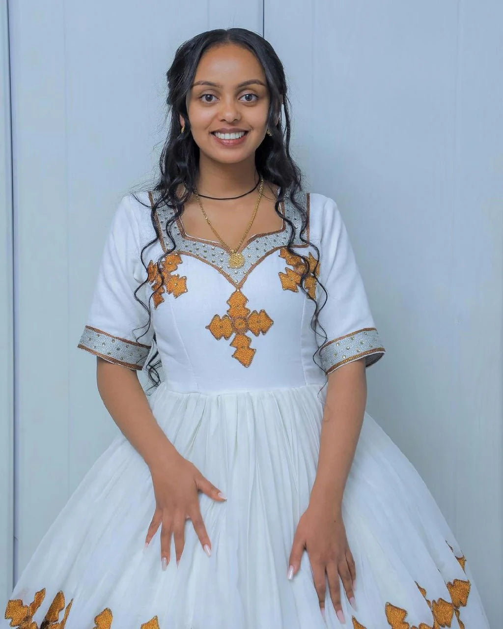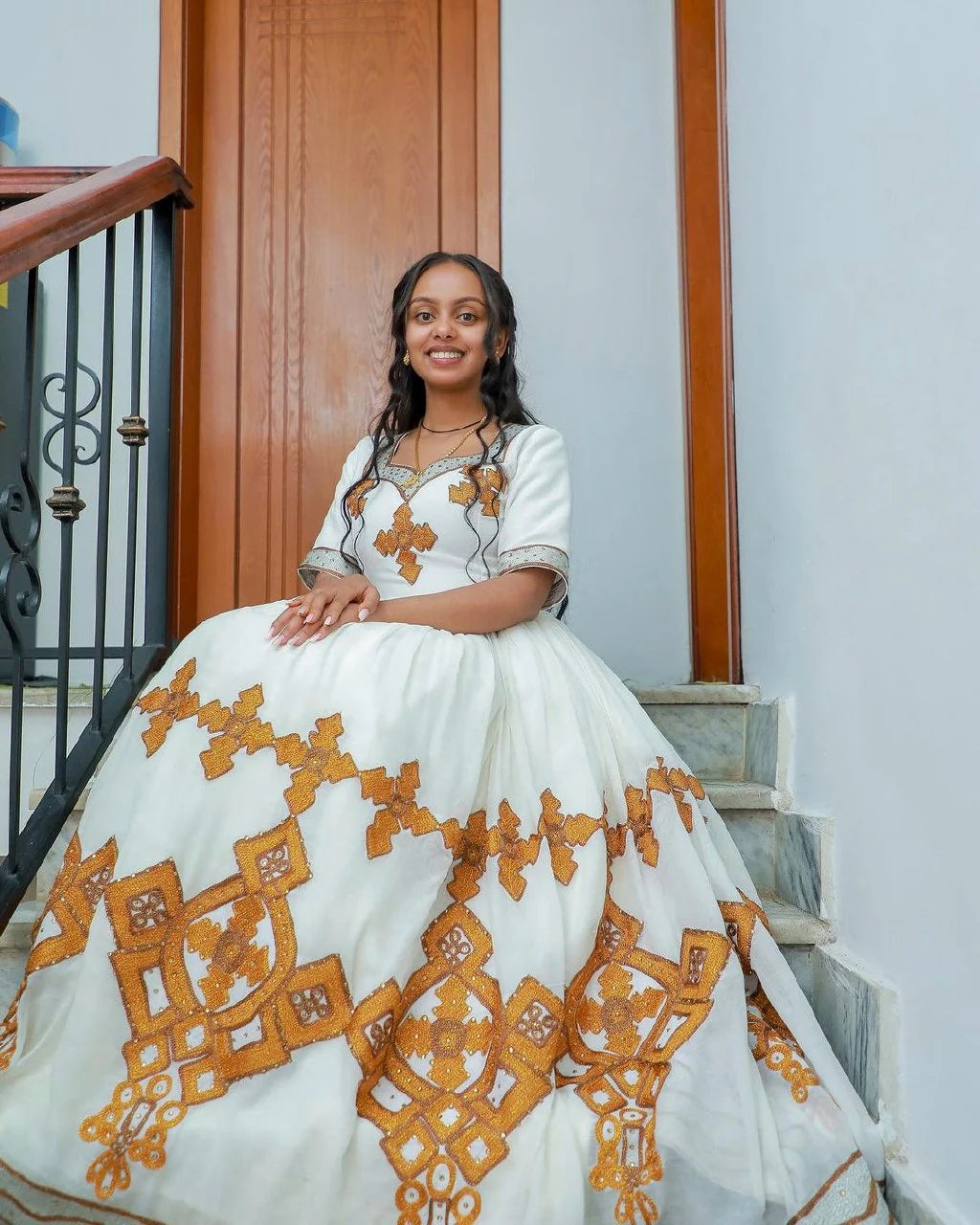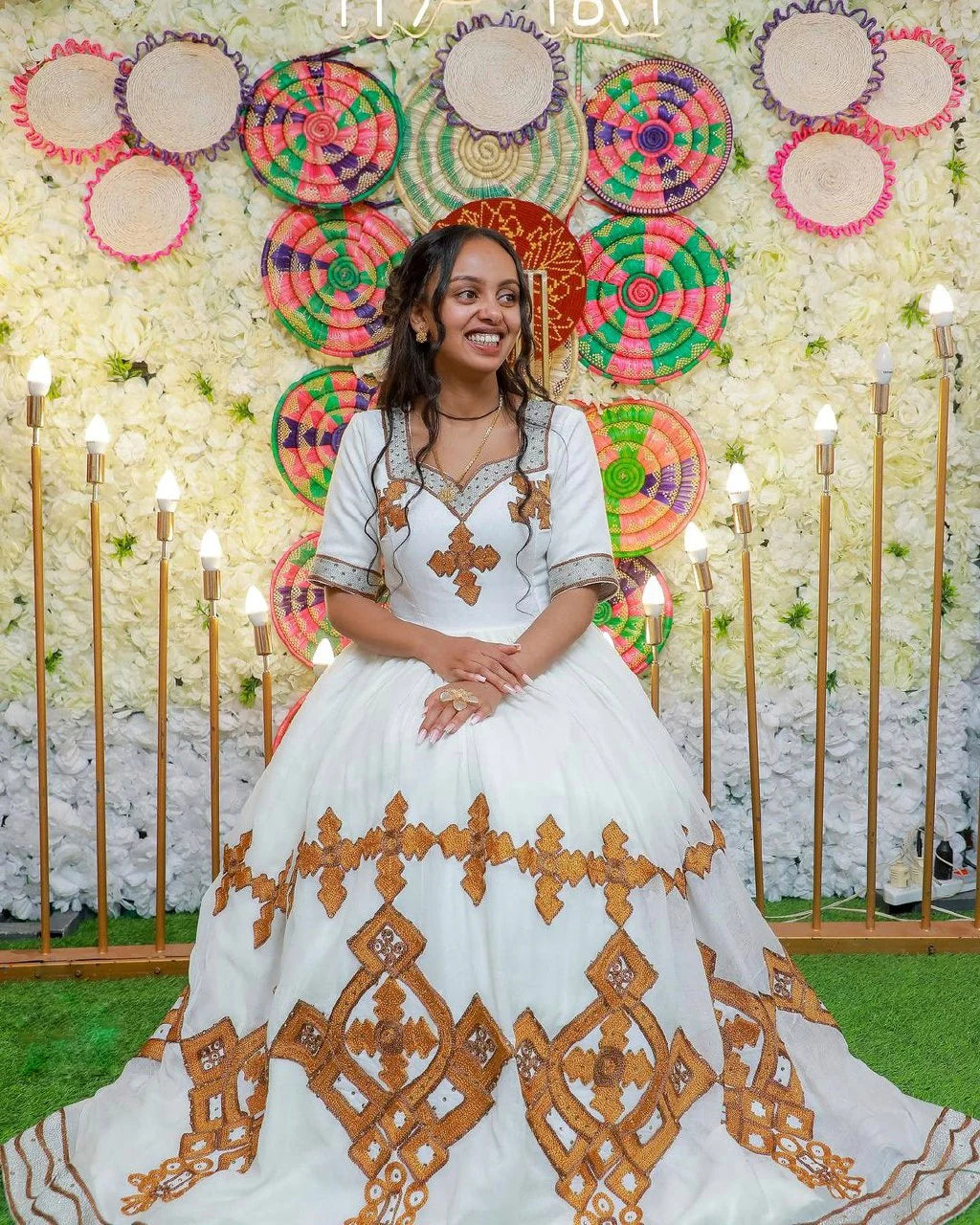 The Habesha dress, often referred to as Habesha Kemis, is a beautiful representation of Habesha traditional attire. This exquisite bridal gown is embellished with shimmering beads, highlighting exceptional artistry and the vibrant cultural legacy of the Habesha people.