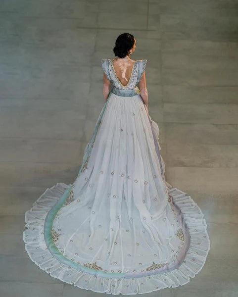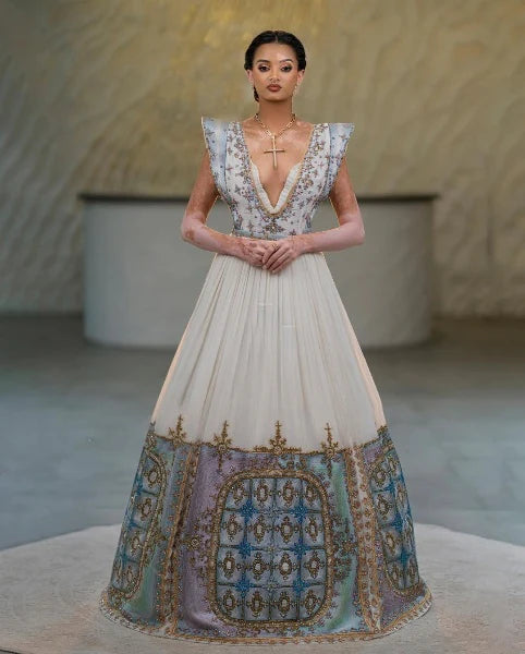This elegant Habesha dress features a stunning combination of soft hues and intricate gold detailing. The deep V-neckline and flutter sleeves add a modern touch, while the flowing skirt showcases beautiful embroidery along the hem. Perfect for formal occasions, it beautifully marries tradition with contemporary style.