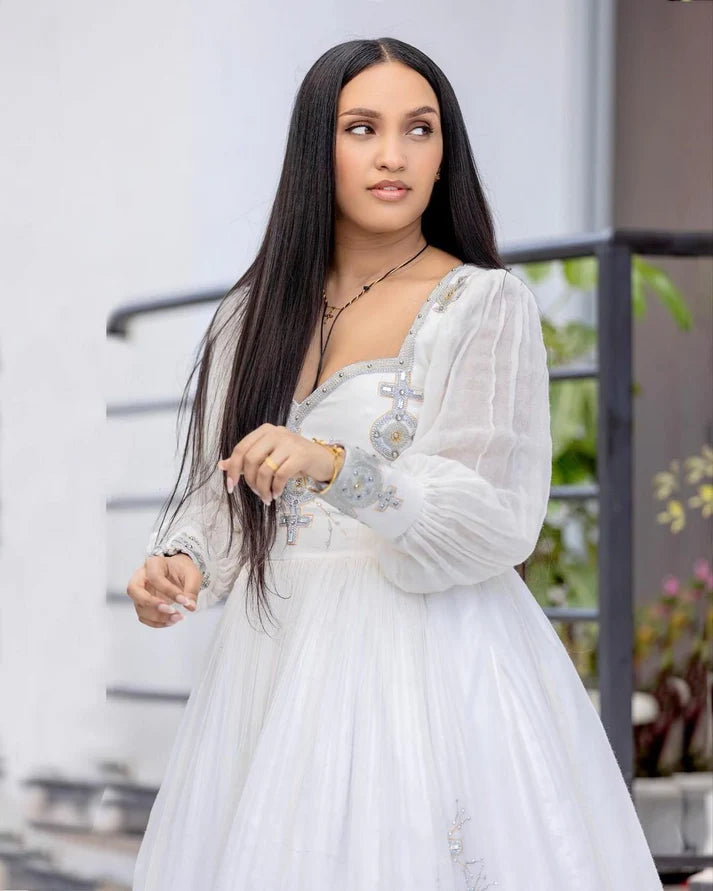 The Habesha dress is a stunning traditional Ethiopian gown, characterized by its elegant white fabric and intricate beading. Featuring long sleeves and a flowing silhouette, it is adorned with delicate floral embroidery, making it perfect for special occasions like weddings. This attire beautifully blends cultural heritage with modern style, showcasing the grace and beauty of Ethiopian craftsmanship.