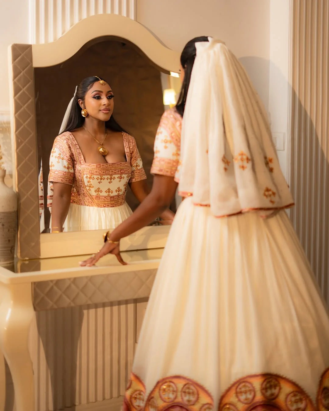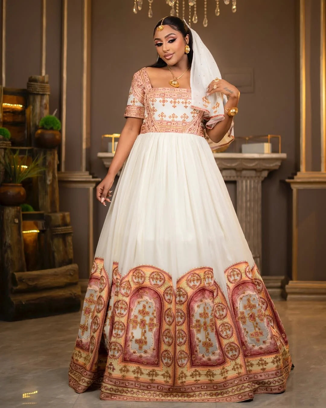 This Habesha dress showcases a beautiful fusion of tradition and style. Featuring a rich combination of white and deep colors, the garment is adorned with intricate embroidery and cultural designs. Its flowing silhouette and elegant details make it ideal for special occasions, reflecting the vibrant heritage of Ethiopia and Eritrea.