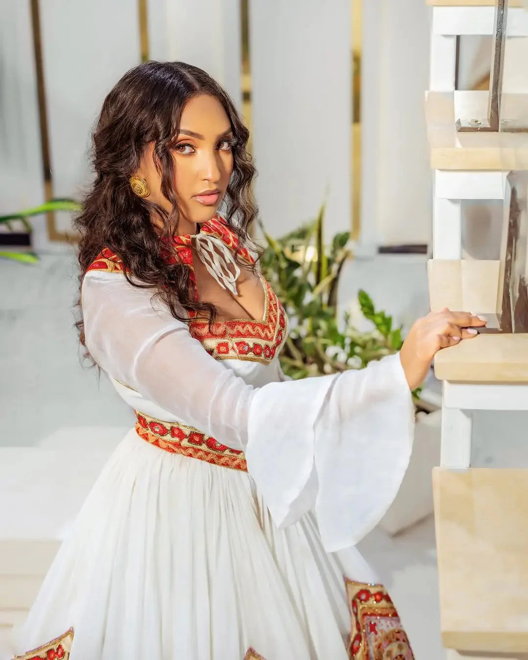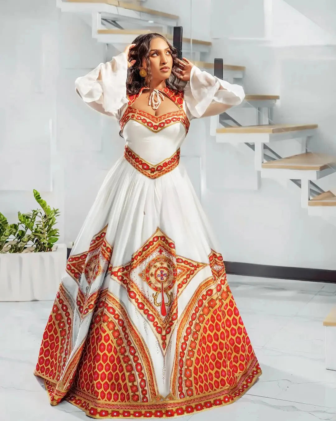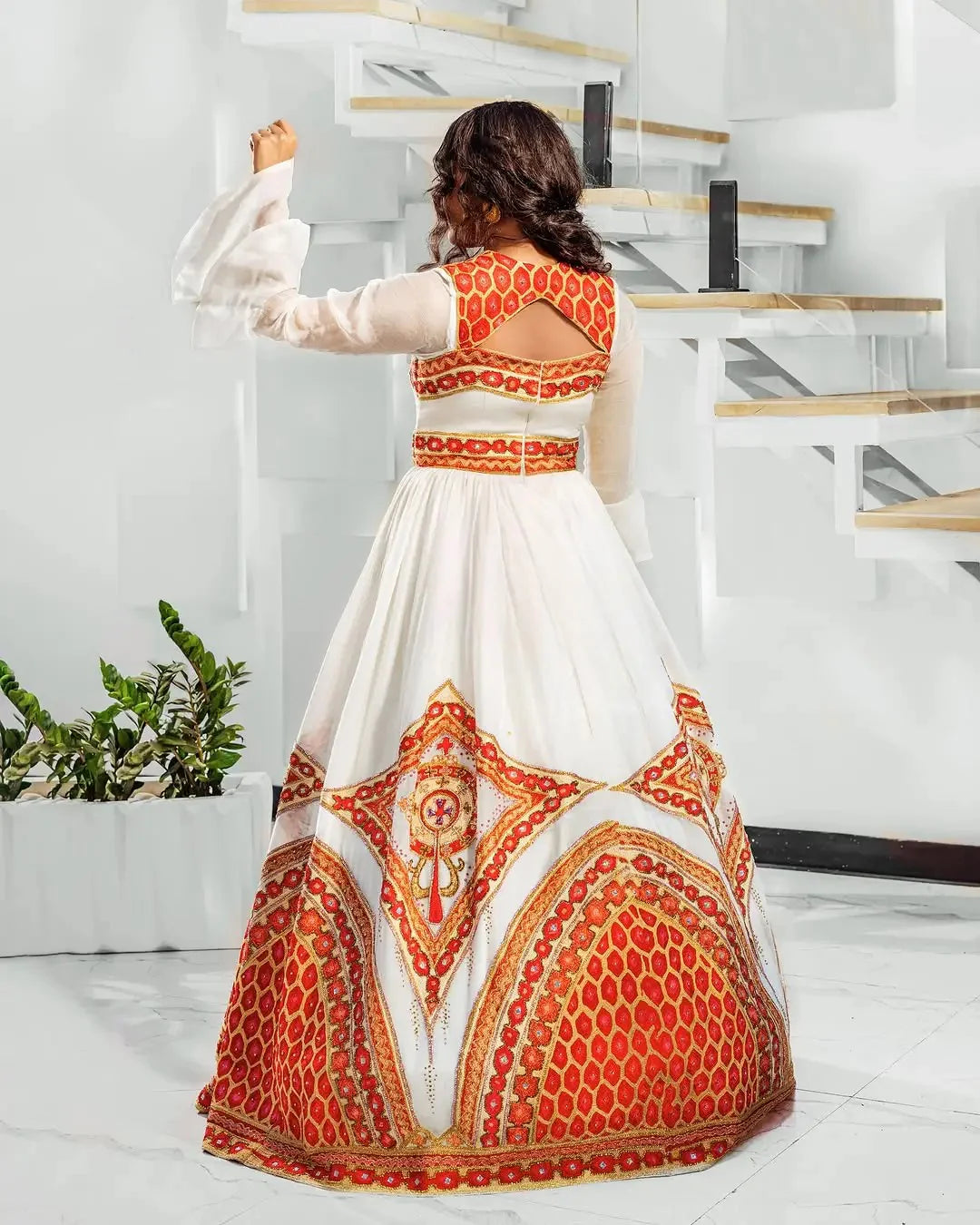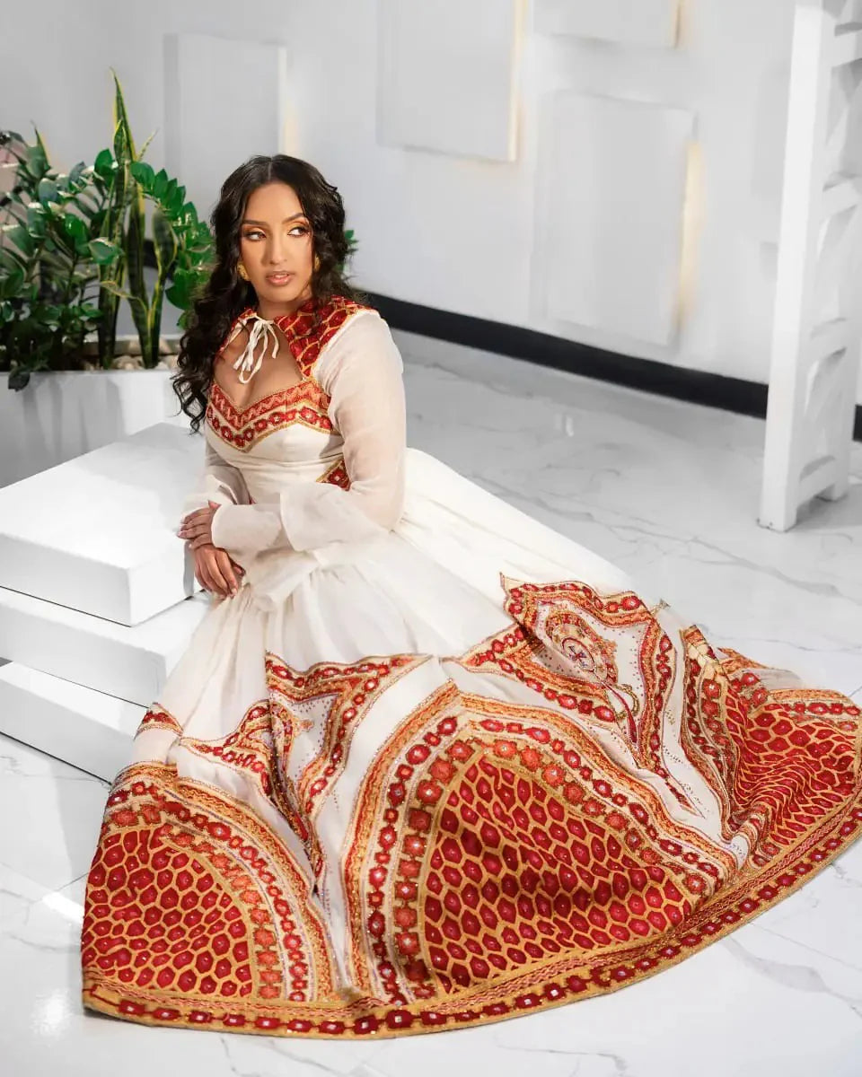Embrace the timeless elegance of Habesha culture with this stunning red dress. Whether you're celebrating a special event or looking to infuse a bit of Habesha charm into your daily attire, this exquisite wedding gown perfectly marries tradition with modern design.