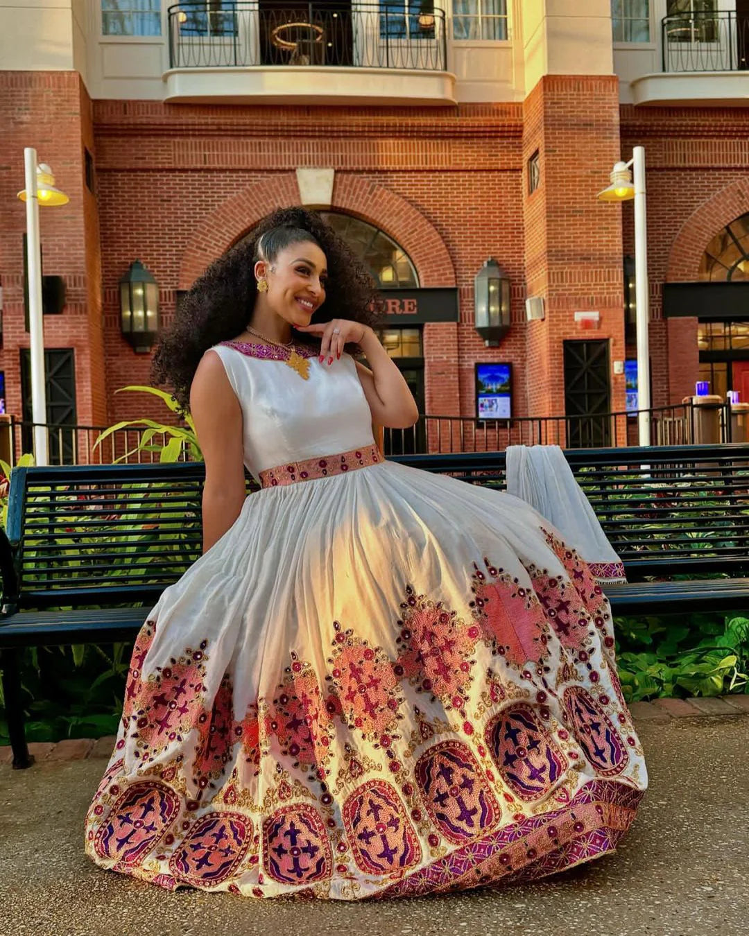 Discover the enchanting allure of modern Habesha fashion with this stunning kemis, featuring intricate beadwork in vibrant pink and purple. This traditional attire beautifully blends rich Habesha heritage with contemporary style, perfect for special occasions.