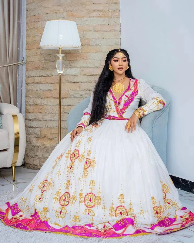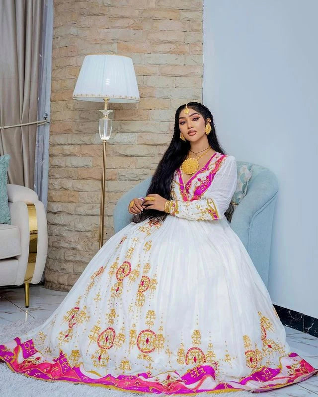 Immerse yourself in the beauty and elegance of the Habesha culture with this captivating Habesha dress, also known as Habesha Kemis. This sparkling pink wedding dress is adorned with shimmering accents, embodying the rich cultural heritage of Ethiopia. Perfect for your special day, this enchanting creation will make you shine and create lasting memories.
