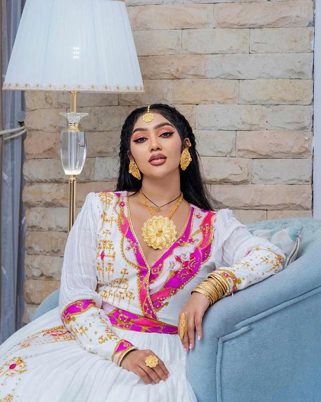 Enchanting Habesha wedding dress radiates beauty and elegance with its captivating pink hue