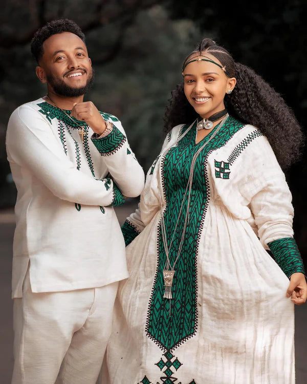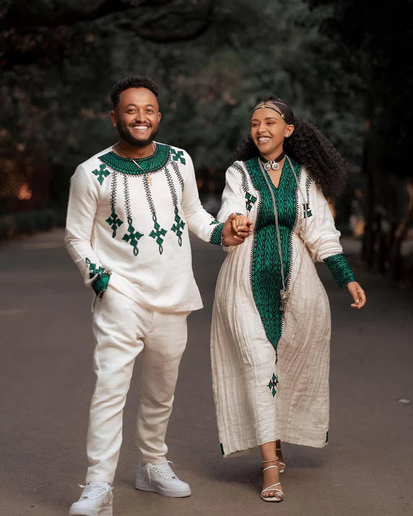 Discover the beauty of Habesha tradition with our exquisitely crafted couples' outfit, made from premium Fetil fabric and soft cotton. This striking green ensemble features intricate designs that blend heritage with modern style, perfect for celebrating unity and cultural richness together.
