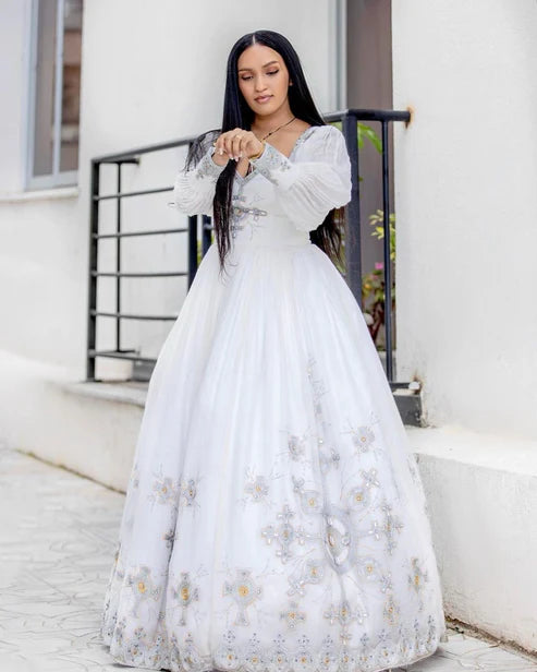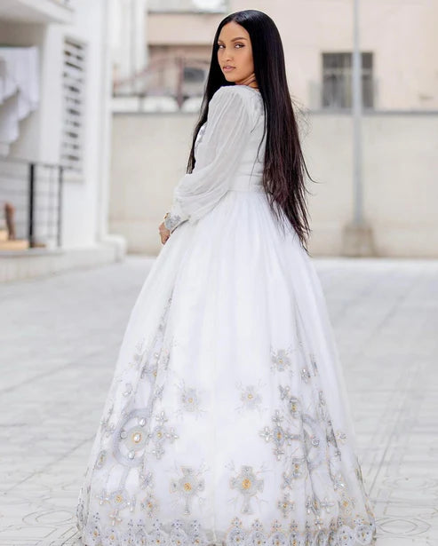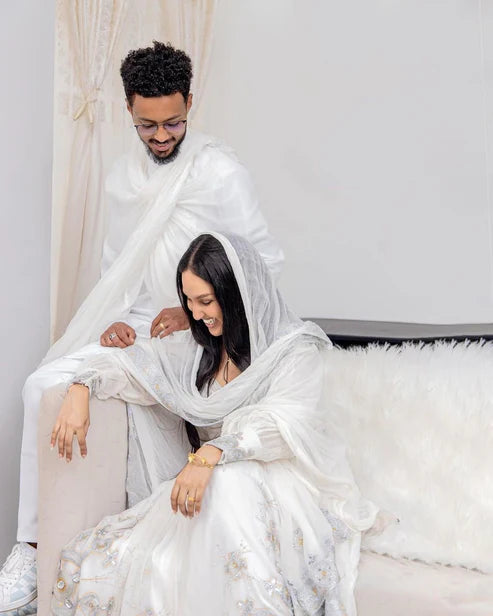 Experience the celestial harmony of our handwoven Habesha outfit, crafted from Menen fabric, thread, and cotton. The elegant dress for her showcases exquisite detailing, while the complementary shirt for him blends tradition with contemporary style, making it perfect for weddings, cultural events, and special gatherings.