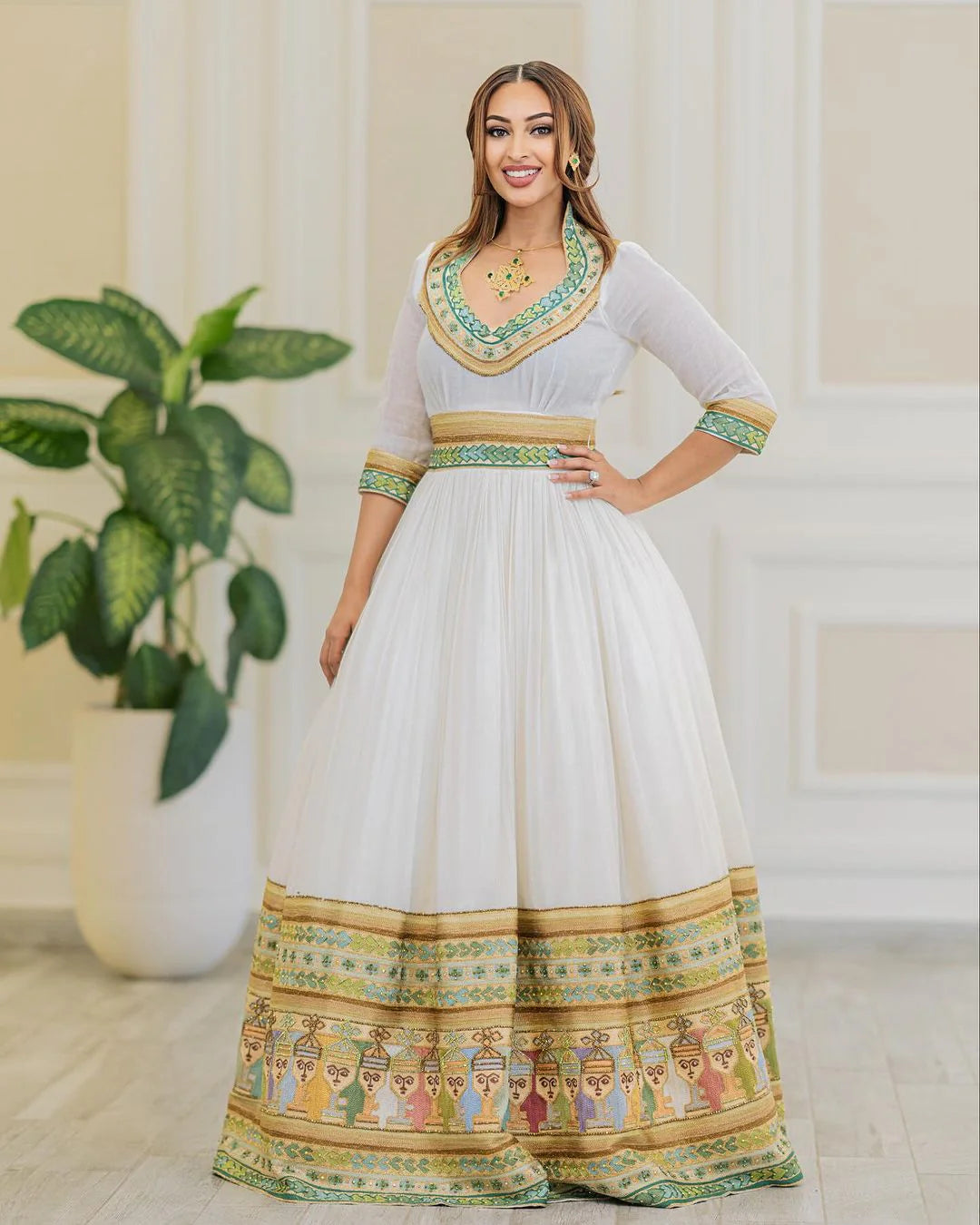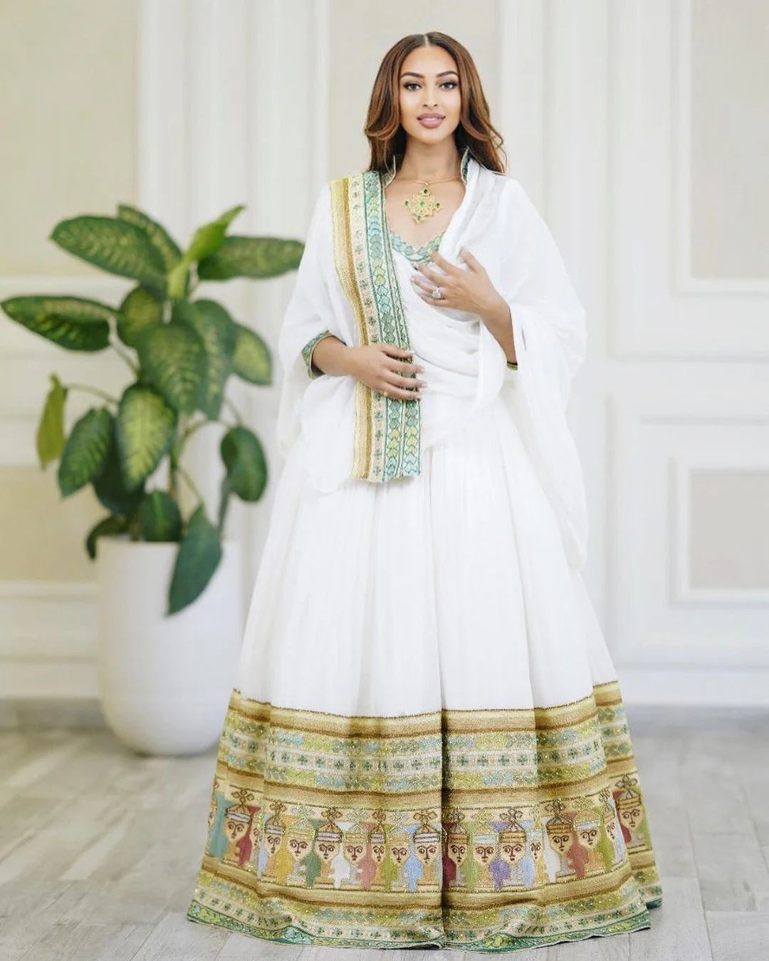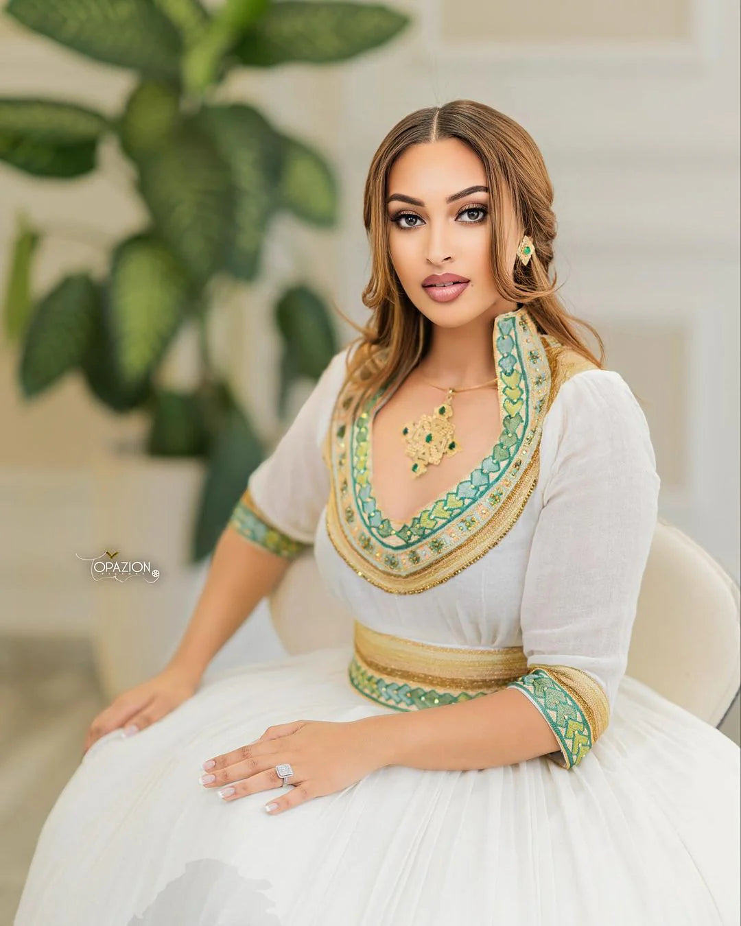 Celebrate your special day with our Wedding Habesha Kemis—an elegant handwoven dress crafted from Menen fabric and adorned with intricate embroidery. This vibrant creation embodies cultural heritage and timeless beauty.
