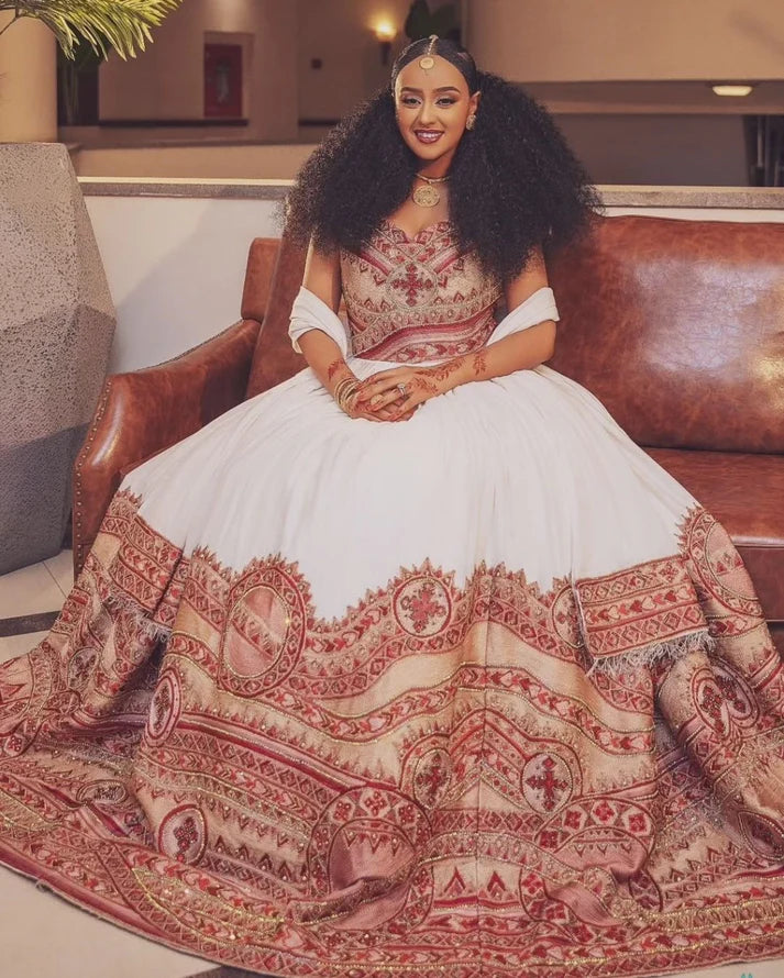 This Habesha dress features a beautiful white fabric with intricate floral embroidery and delicate beading. Its elegant design, complete with long sleeves and a flowing silhouette, makes it a perfect choice for weddings and special occasions, showcasing the rich cultural heritage of Ethiopia.