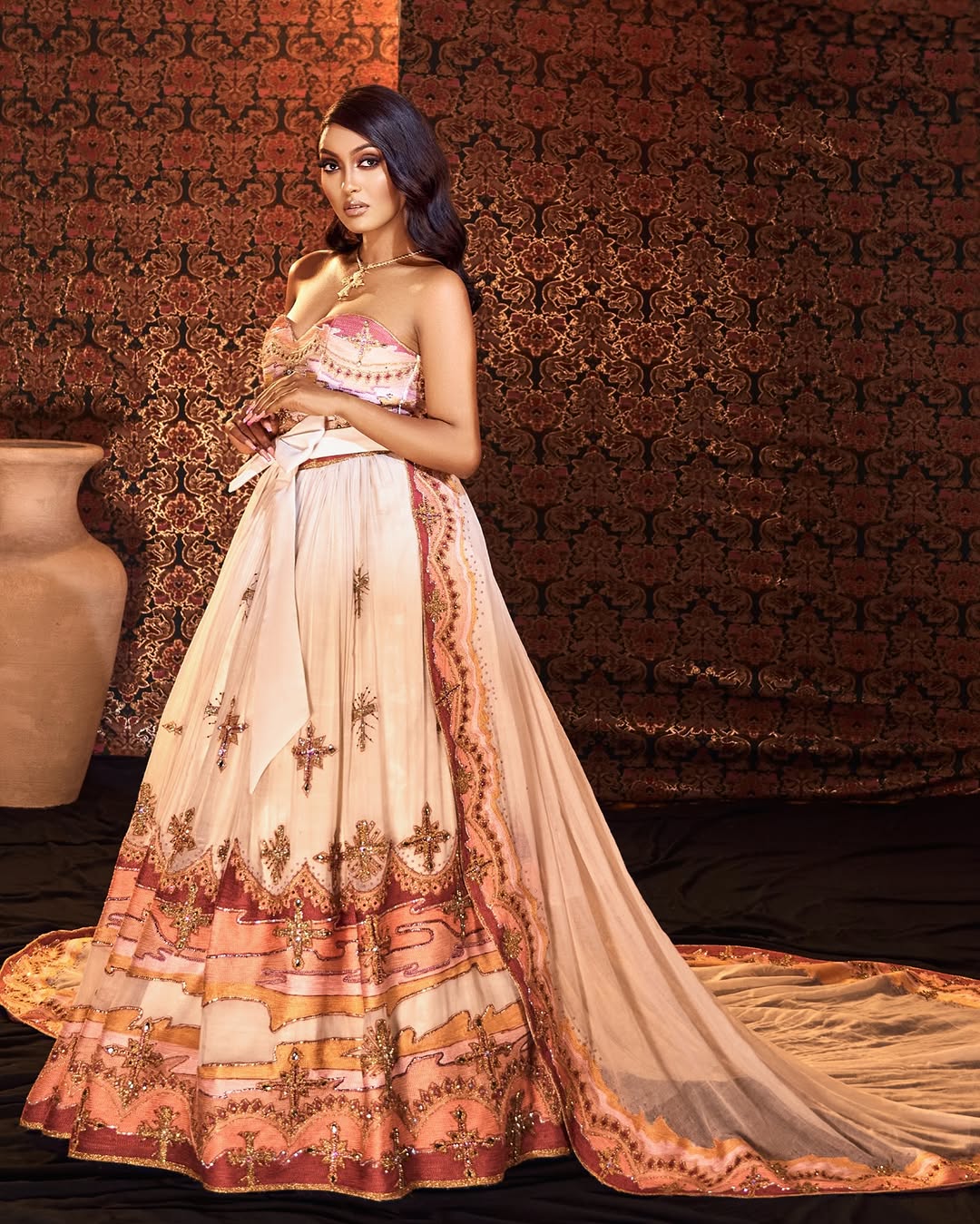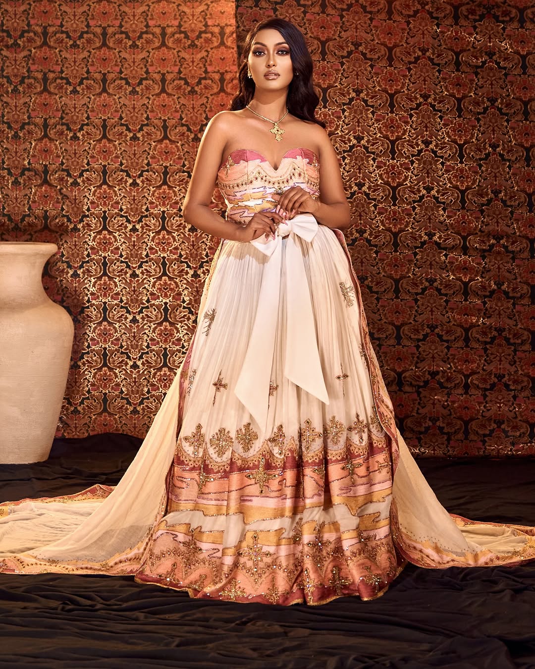 This stunning Habesha dress features a delicate blend of soft hues with intricate gold and pink embroidery. The strapless design and flowing skirt create a glamorous silhouette, making it a perfect choice for formal events while celebrating Ethiopian artistry.