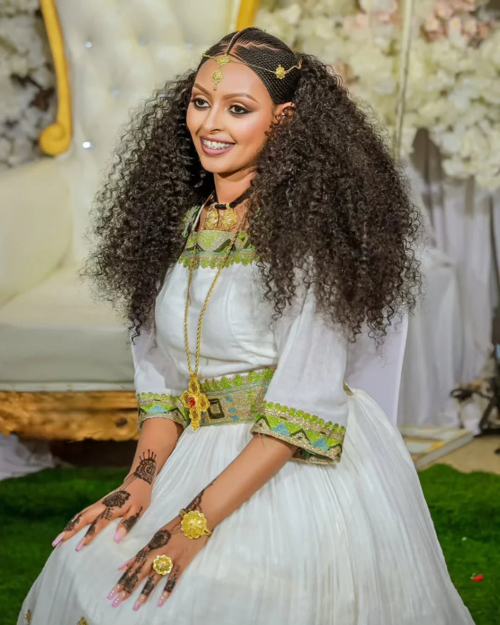 This Habesha clothing ensemble beautifully merges tradition with modern style. The woman's flowing white gown is adorned with intricate gold embroidery, while the man's outfit features matching details that enhance their connection. Ideal for festive occasions, this attire reflects cultural heritage and elegance.